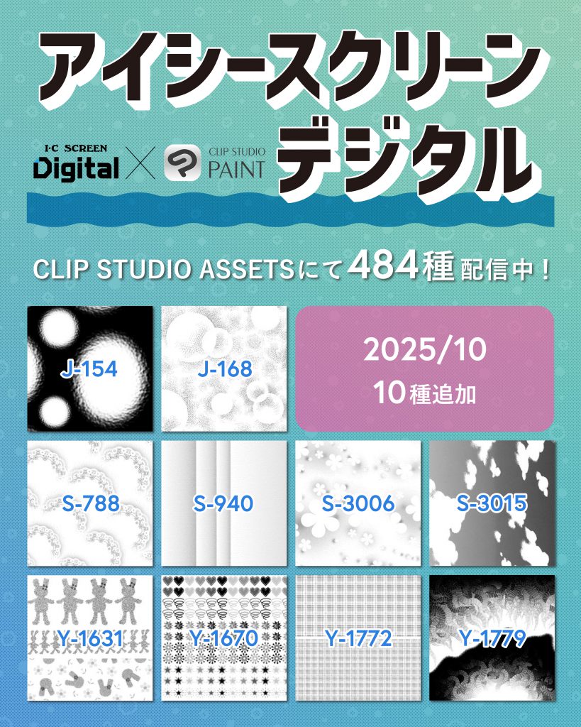 CLIP STUDIO PAINTでご使用いただける「アイシースクリーンデジタル」の2025年10月分の品番が追加されました。アイシースクリーンデジタルは毎月10日前後(10日が土日祝の場合は前倒しの平日)に10種の品番の追加を予定しております。