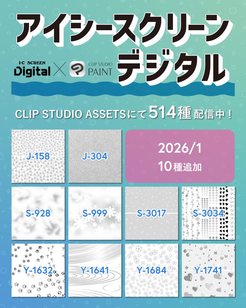CLIP STUDIO PAINTでご使用いただける「アイシースクリーンデジタル」の2026年1月分の品番が追加されました。アイシースクリーンデジタルは毎月10日前後(10日が土日祝の場合は前倒しの平日)に10種の品番の追加を予定しております。